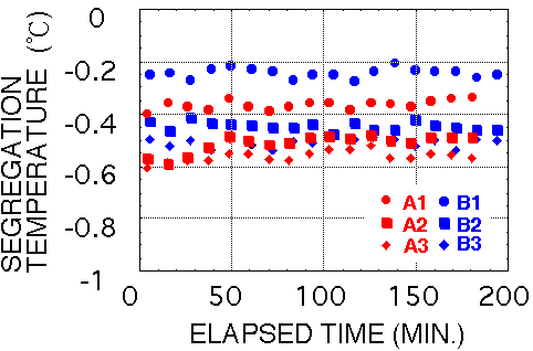 A, Bはそれぞれ温度勾配0.2, 0.125K/mmの実験結果。